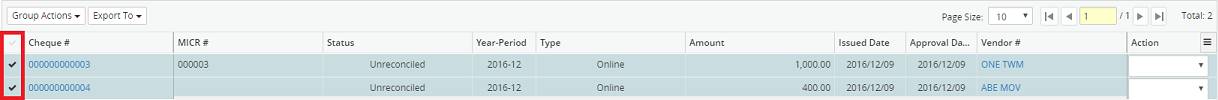 5. Select as many or as few cheques from the results displayed in the grid, by clicking the corresponding check mark beside each cheque or click the check mark at the top of the grid to select all cheques.