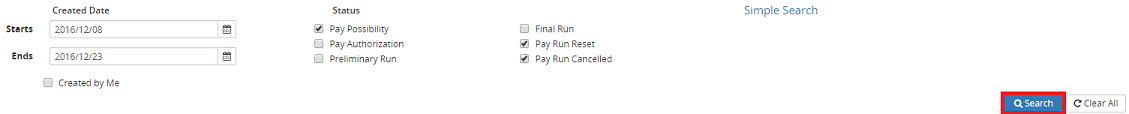 5. Click on the Search button. The pay runs that meet the search criteria will be displayed in a grid.