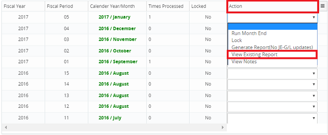 2. Click on the Action drop-down beside the corresponding month and select View Existing Report.