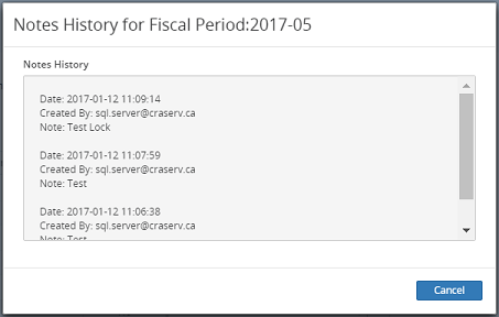 3. In the Note History for Fiscal Period dialog box, all notes added this fiscal period will display here and are read-only.