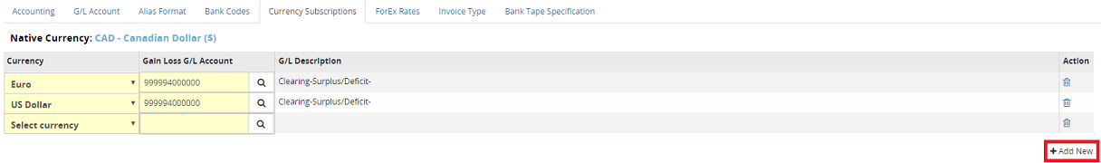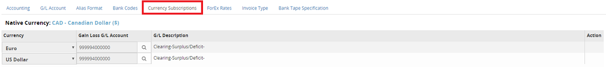 If foreign currencies are being used, the Currency Subscriptions tab identifies the currency as well as the Gain Loss General Ledger account, which will be used on the batch code.