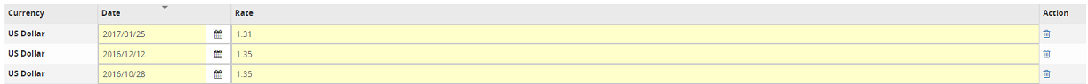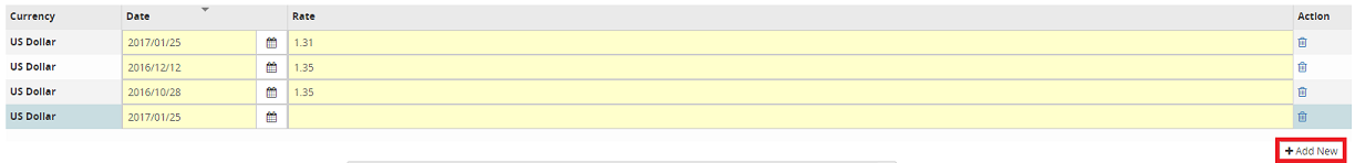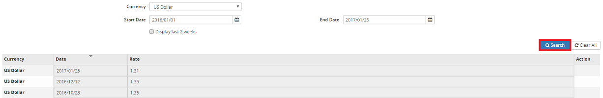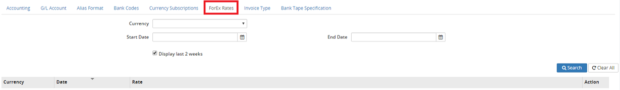 Note: When accessing the ForEx Rates tab, all foreign exchange rates input in the last 2 weeks will displayed in the grid. If necessary, perform a search. For step by step instructions, refer to Search (above) for more information.
