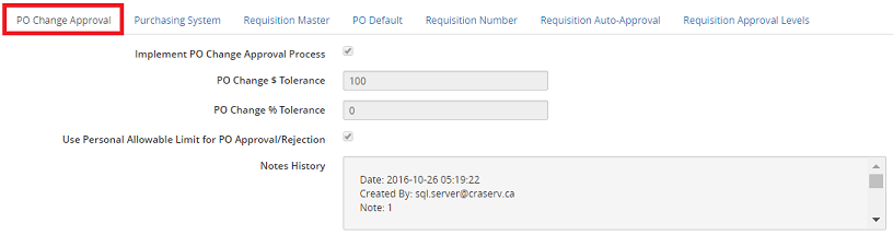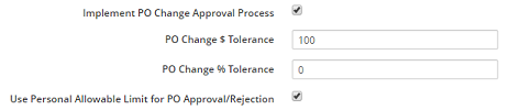 The PO Change Approval tab provides the necessary parameters for initiating an approval process when completing a purchase order change, resulting in an increase to the dollar amount, which exceeds the tolerance levels in this setting.