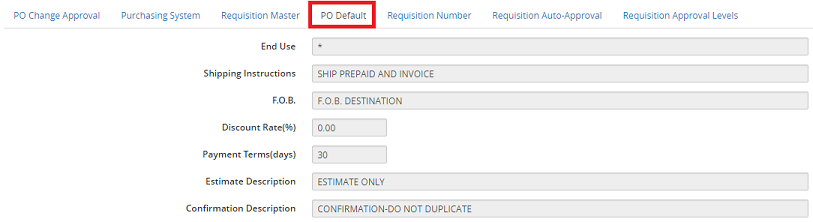 The PO Default tab is used to aid in the entry of common and often duplicated information on purchase orders. These fields will display on the purchase orders prefilled to avoid repetition. It also describes some of the functional operations required in the purchase order process.
