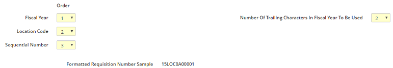 The Order represents the position of the fields in the requisition number. Fiscal Year can be a maximum of four (4) characters. Location Code can be a maximum of five (5) characters. Sequential Number can be a maximum of 5 numbers, however the whole requisition number can only be a maximum of twelve (12) characters in length.