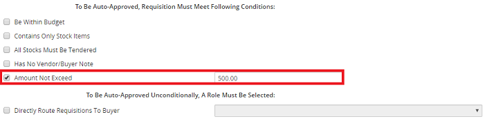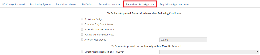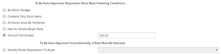 4. If applicable, in the To Be Auto-Approved, Requisition Must Meet Following Conditions section, select or deselect any of the following selection boxes: Be Within Budget, Contains Only Stock Items, All Stocks Must Be Tendered, Has No Vendor/Buyer Note and/or Amount Not Exceed.