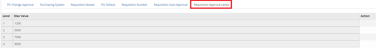 The Requisition Approval Level tab provides the facility to add or edit different levels of approval to be attached to different approvers. These levels define the maximum dollar amount that the user can approve for a requisition. Based on the level hierarchy, the approval routing will manage the delivery of requisitions to the appropriate approvers based on their approval levels. Approvers will be assigned levels in their permissions.