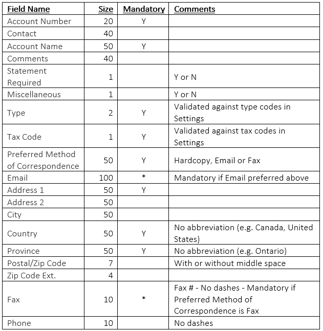 The A/R Account Import enables the user to import A/R account information, instead of having to key it in A/R Account Management> Create A/R Account. Account numbers in the import file that already exist in K212 Finance will be treated as updates; numbers not already existing will be treated as adds. The fields in the chart below can be imported.