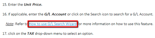 1. The user is working on How to Create a Requisition and in the Miscellaneous Requisition section, on Step 16 and they do not know how to use the G/L Search Wizard feature. The user can click on the How to Use G/L Search Wizard hyper link to be brought to that process and get more information.