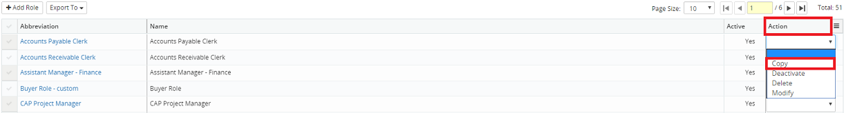 2. Click on the Action drop-down menu beside the corresponding role and select Copy.