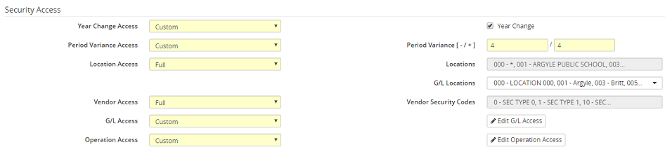 7. If applicable, in the Security Access section, click on the Year Change Access drop-down menu to update one of the following options: Full, None or Custom.