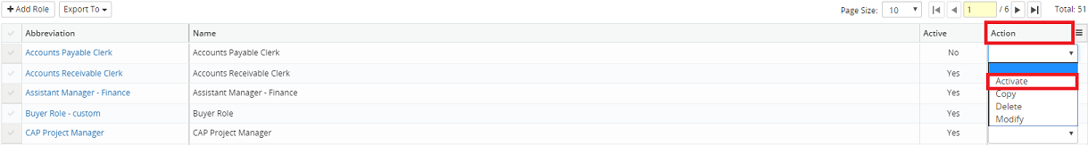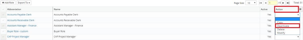 2. Click on the Action drop-down menu beside the corresponding role and select Activate or Deactivate.