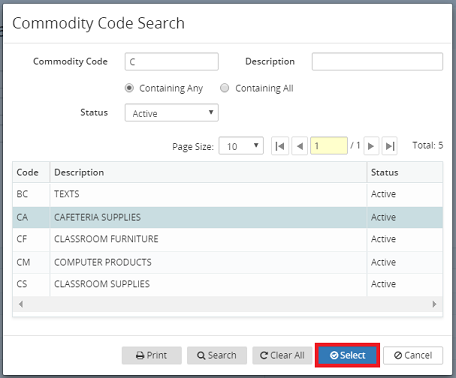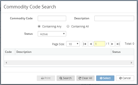 7. Click on the Select button to select the commodity code and return to the previous screen.