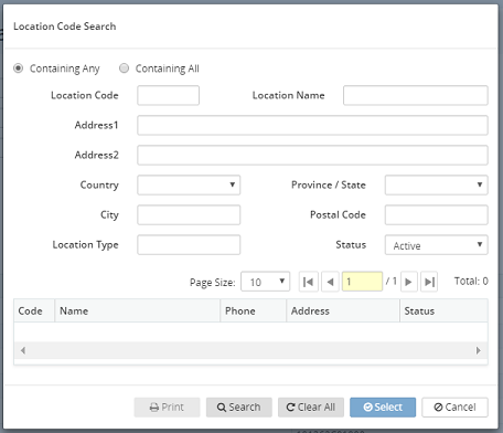 Note: Click on the Cancel button to return to the previous screen without entering a location code.