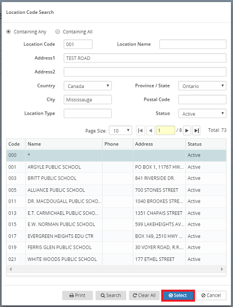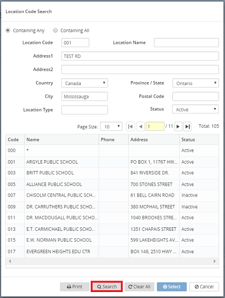 Note: To print the results displayed in the grid, click on the Print button to download a .pdf file.