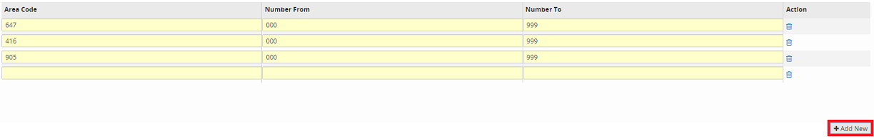 5. In the new line, under the Area Code column, enter a three (3) digit area code.