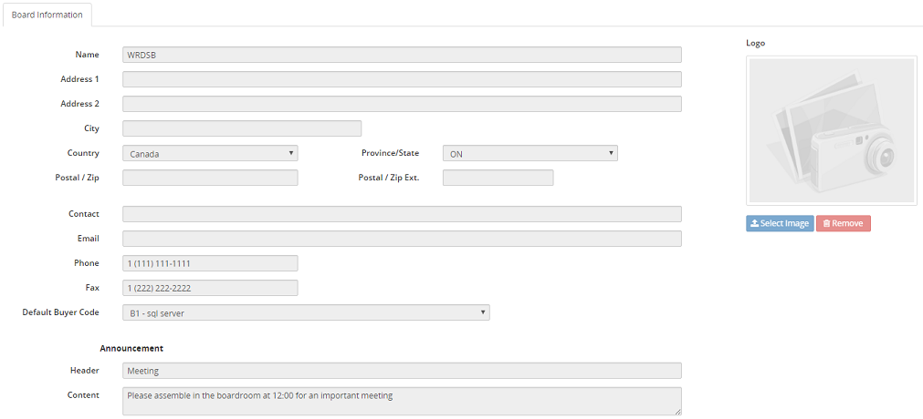 The Board Information tab is used to enter board location and contact information. This tab also is where announcements can be created and board logos can be uploaded. The Announcement and Board logo will be displayed in the K212 Finance Dashboard.