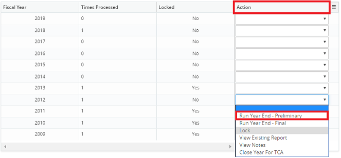 2. Click on the Action drop-down menu beside the corresponding year and select Run Year End- Preliminary.