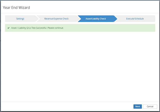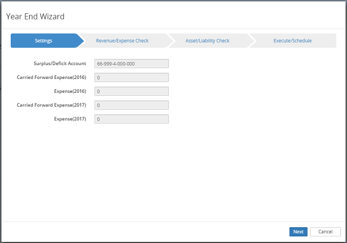Note: If the next button is unavailable, ensure the Surplus/Deficit Account number is a current available G/L account. Refer to Year End for more information on the surplus/deficit account.