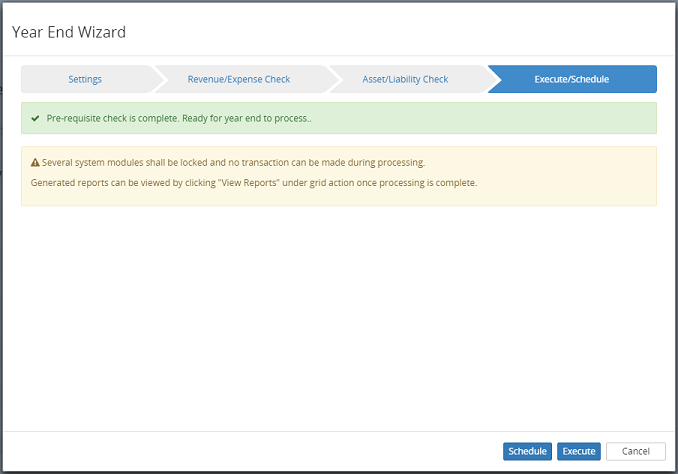 7. In the Execute/Schedule section, click on the Schedule to process the month end at a later date or click on Execute to process immediately.