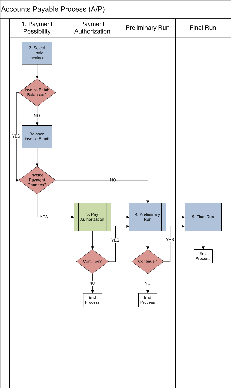 Below is a work flow demonstrating the various steps to complete the Accounts Payable (A/P) process: