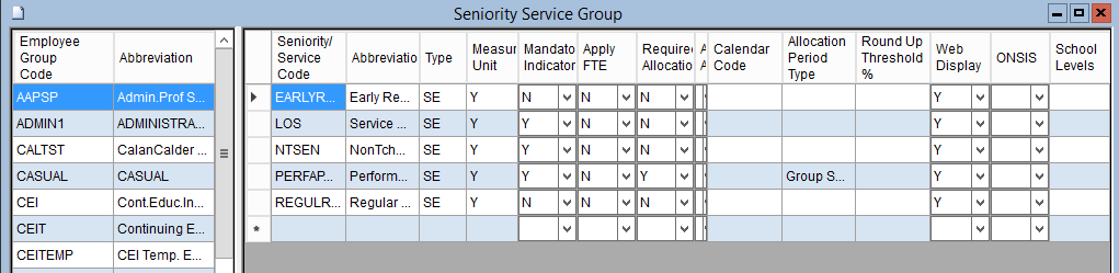 4. Select an Employee Group Code to be setup with the Seniority / Service Code