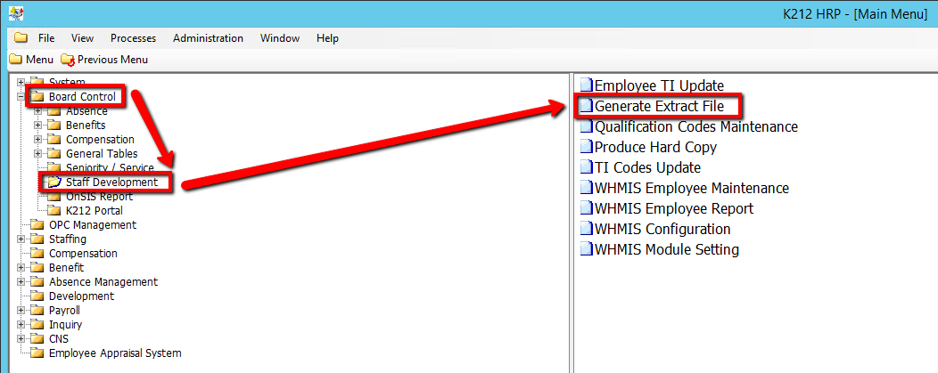 This screen is used to run a background process that generates an extract file from the K212 HRP database containing Board Employees' Social Insurance Numbers. The Ontario College of Teachers uses the extract file to match against their database.