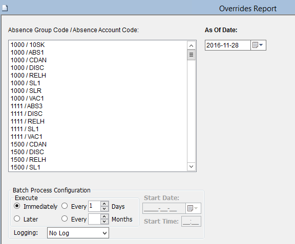 This screen produces the Overrides Report. It lists anyone with an Override on the Accounts and Individual Calendar screen with an active position on the As Of Date for the Absence Group/Account combinations selected in the parameters.
