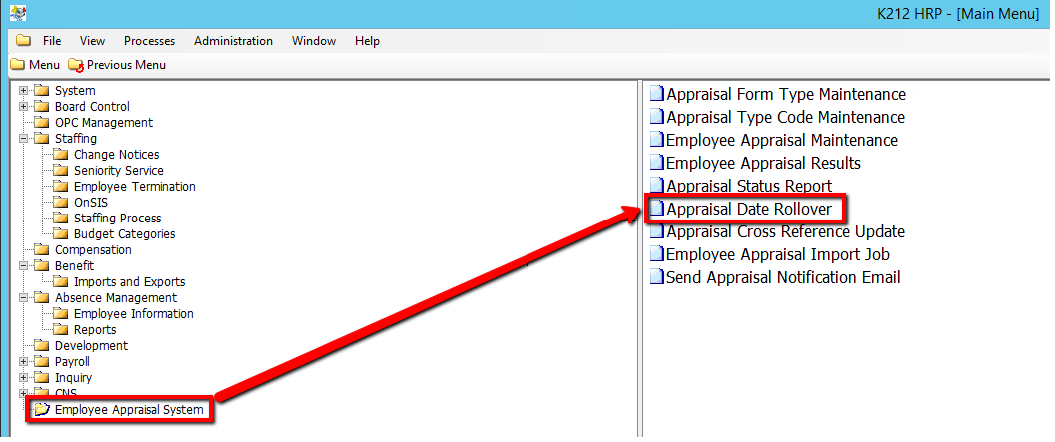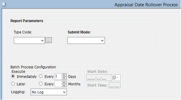 This screen will roll Employee Appraisals forward on the Employee Appraisal Maintenance Screen and insert a new record for the next Appraisal Due. The next Appraisal Code Due is pre-defined on the Appraisal Code Maintenance screen. The report generated is a list of all those employees whose records have been updated.