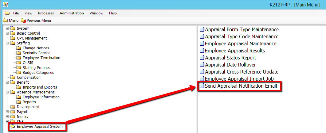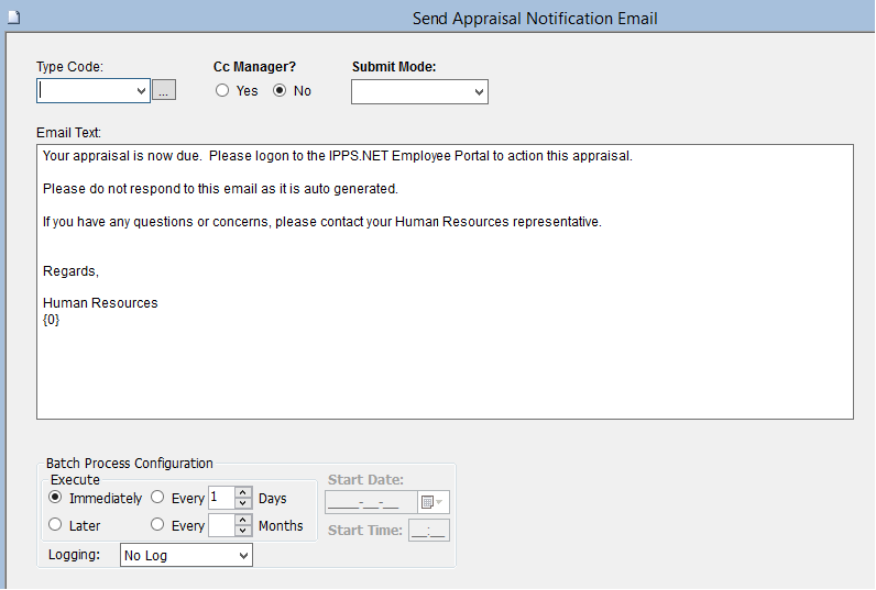 This screen produces the Send Appraisal Notification Email Report; identifying employees that received an email as well as those employees that did not; due to the related error message. Emails will not be resent; the ‘Date Email Sent’ will identify the date populated by a previous submission. When submitted in Update Mode, this process will send an email to all employees with an Active Appraisal and a Preferred Email Address on their Identification record.