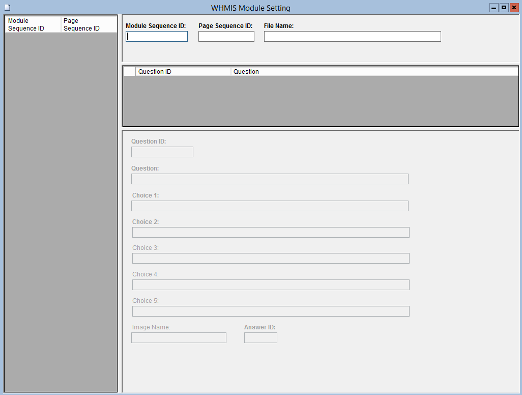 This screen is used to setup WHMIS Module & Settings. User's can define which set of questions will be for a specific test, which sequence questions will be displayed, , what questions will be displayed, multiple choice answers, the correct answer for each question & where their tests/questions will be saved.
