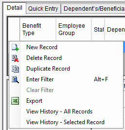 The Benefits screen identifies Benefits that apply to an Employee, who pays for the Benefits (i.e. Board or Employee) and who the Beneficiaries are.