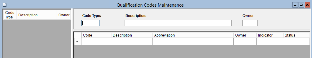 This screen is used to add, modify or delete Board owned qualification Code Types (B) and the codes associated with each Qualification Code Type. However, qualifications owned by the Ontario College of Teachers (M) cannot be added, modified or deleted on this screen as this  occurs in the background processing screen, TI Codes Update in the Staff Development menu.