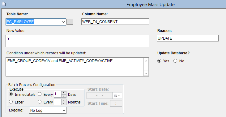 •If Update mode is selected, this process performs a Mass Update on the database using a simply constructed SQL statement. This process should only be run if the impact of running an SQL statement directly on the database, if fully understood.
