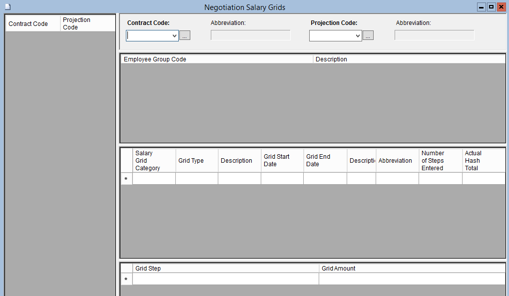 This screen is used to add, modify or delete a Salary Grid Category for an Employee Group for the purposes of projecting scenarios during contract negotiations. Changes are not made to the current Salary and Allowance Grids that exist in HRS at the Board level. This menu option is used to make manual corrections after Projection Build is done in the previous menu option, Build Projection Grids. At this point, these projected grids have not been created in the actual grids tables. They represent potential grids only and can be amended, accepted or ignored.