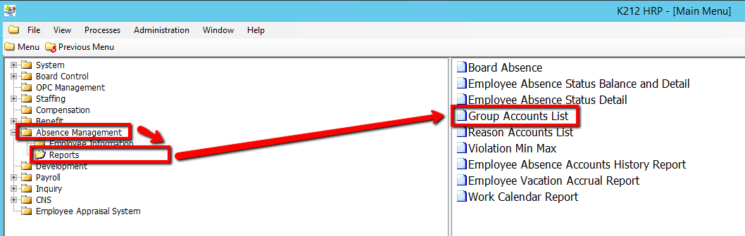 This Group Accounts List report contains a list of all Absence Accounts assigned to each Absence Group.