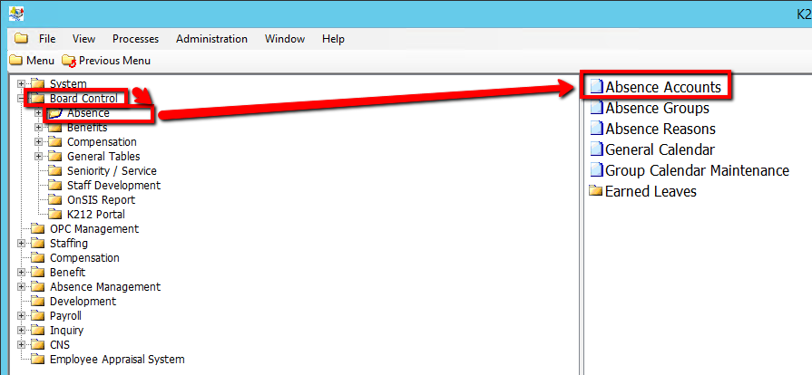 6. Select a current Absence Account Code to modify or Select New at the top of the menu screen to add a new code