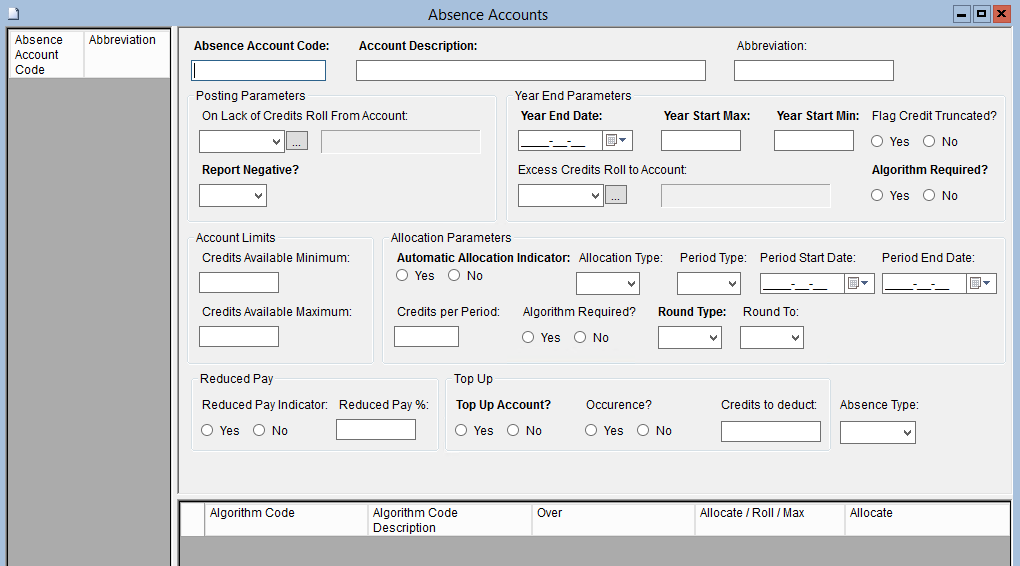 This screen is used to add, modify or delete an Absence Account definition (i.e. a type of Absence Account). Examples of Absence Account types might be vacation or sick leave. Absence Accounts are used to define parameters for Employee Absence Accounts; these accounts are interlinked by way of 'rolling sequences'. When defining Absence Accounts, the lowest level accounts should be created first. Linkages may be defined between the current sick leave account, for example, and the previous sick leave account.