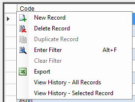 9. Right-click the grey grid below the Code column and Select New Record