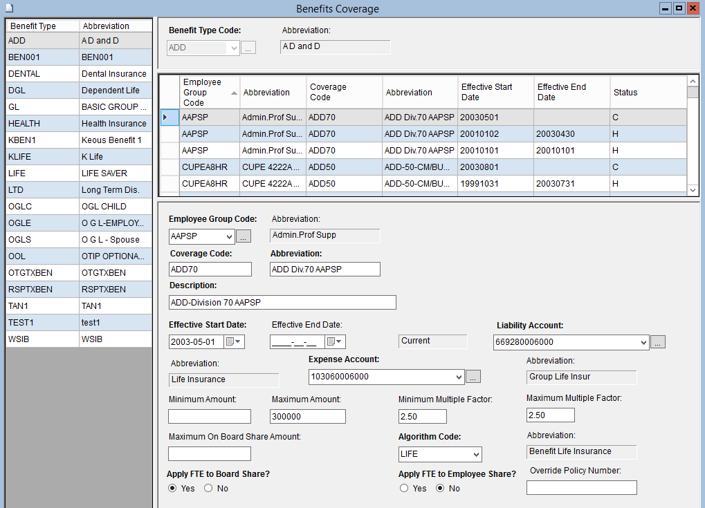 This screen is used to assign Coverage codes to a Benefit/ Employee Group combination. Each Benefit is identified by a Benefit Type Code. Benefit Type Codes cannot be created, deleted or modified on this screen. The Benefit Type Definition screen must be used for Benefit Type Code maintenance.