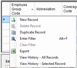 7. Right-click the grey grid below the Employee Group Code column and Select New Record