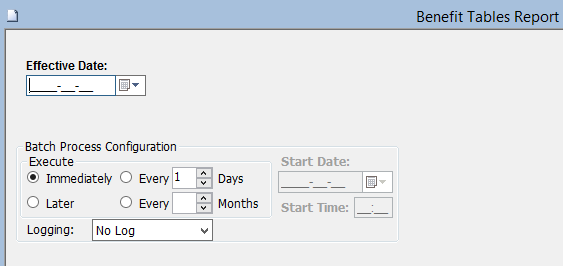 This menu option is used to produce the following reports from associated control tables. Each of the reports listed below, display fields from tables with the same name. The first four reports (Group Benefit Coverages, Benefit Premium Detail, Group Benefit FTE Detail and Group Premium Split Detail) only include records that have a Record Status of A.