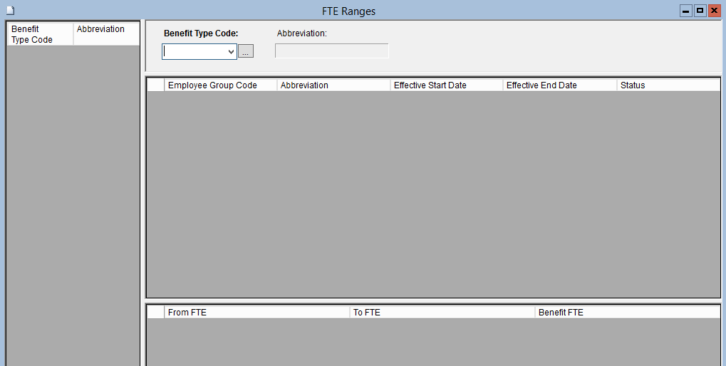 This screen is used to set up Benefit/Group FTE range records which define the proportion of a Benefit Employees are entitled to, based on their FTE.