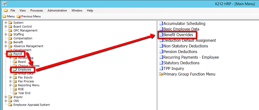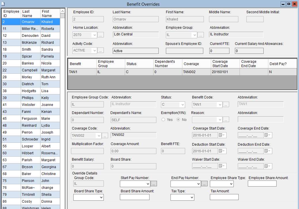 This screen is used to override parameters established for Employee Benefits used in the pay run and to view an Employee's Benefits. You may enter new values to override the established Benefit calculation in the pay runs specified. Each override will only apply for the pay runs specified for each Employee Benefit record containing an override. The Benefit type must be established prior to being queried on or updated here.