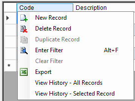 7. Right-click the grey grid below the Code column and Select New Record