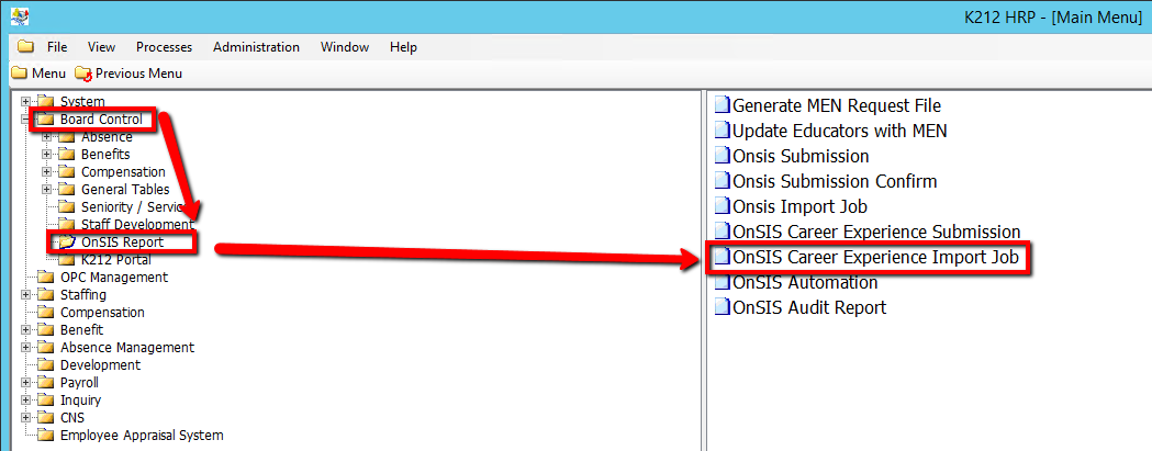 This background process will load OnSIS Career Experience data from a file into the K212 HRP database.  The specifications for this file are included in this guide so that they are available to programmers of other systems. This module can also be used to load the OnSIS Career Experience data directly from OnSIS (ie. the file format is compatible with the CSV file provided by OnSIS).