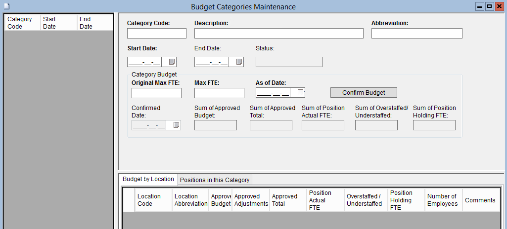 This screen is used to set up budget categories. This module enables the board to compare actual FTE’s to budget FTE’s and assign approved budgets by location. These approved budget values can be used in the Staffing Module and as a validation check when entering new positions.