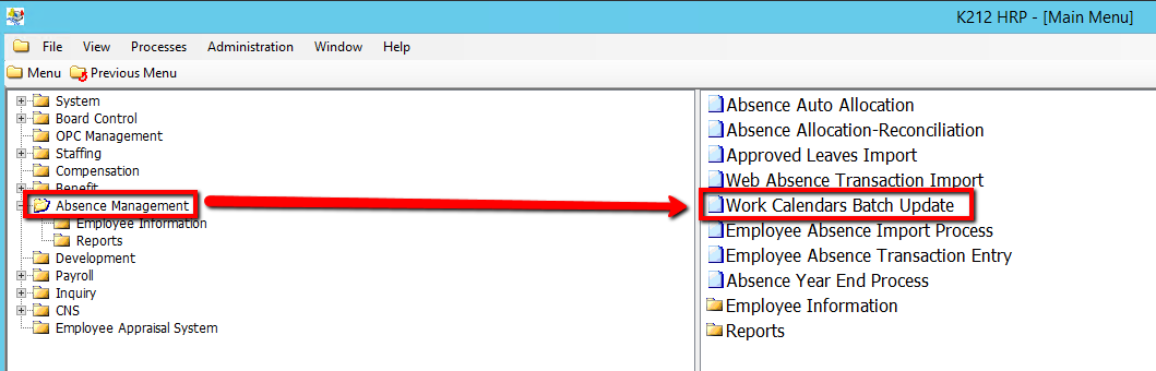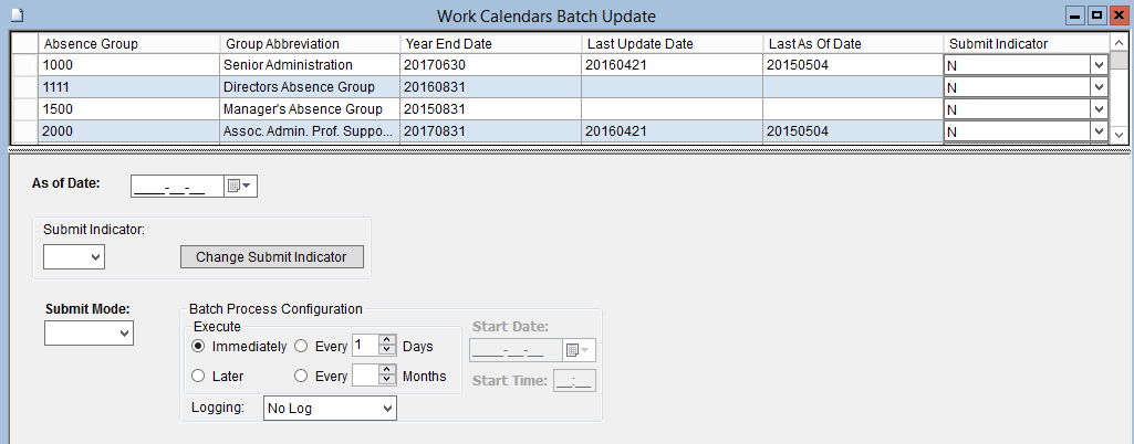 The Work Calendars Batch Update screen is used to process work calendars for a new effective date for any number of Absence Groups.