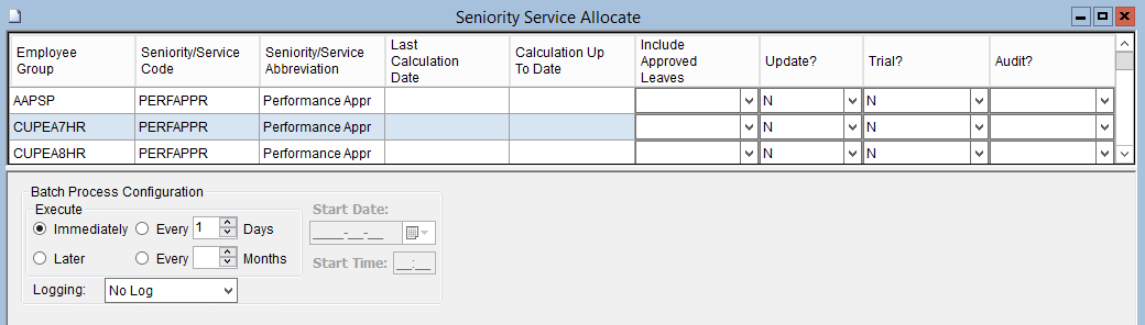 This screen is used to submit a background process which updates each active Employee’s Seniority Service balances (adding to the previous update). This process can be run in either Update or Trial mode. The Seniority Service report is produced as a result of this procedure. When Seniority/Service credits are allocated, the start date and end date from the Employee Position are included at the time the service amount is calculated.