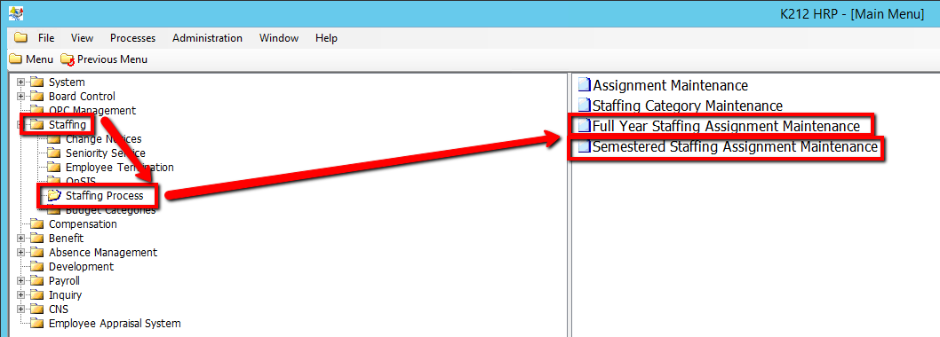 3. Click on Full Year Staffing Assignment Maintenance OR Semestered Staffing Assignment Maintenance (Depending on School Board)